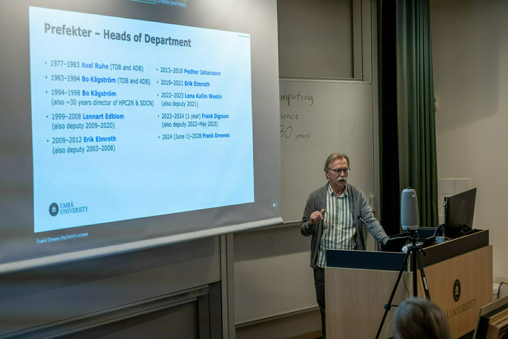 Eftermiddagens event var att fyra personer berättade om sina erfarenheter från att ha jobbat/studerat vid institutionen. Christina Igasto berättade om hur gått från att vara student/doktorand i Umeå, till att nu vara chef på en stor myndighet i Australien. Bosse, Lennart och Erik gav en översikt om institutionens historia.